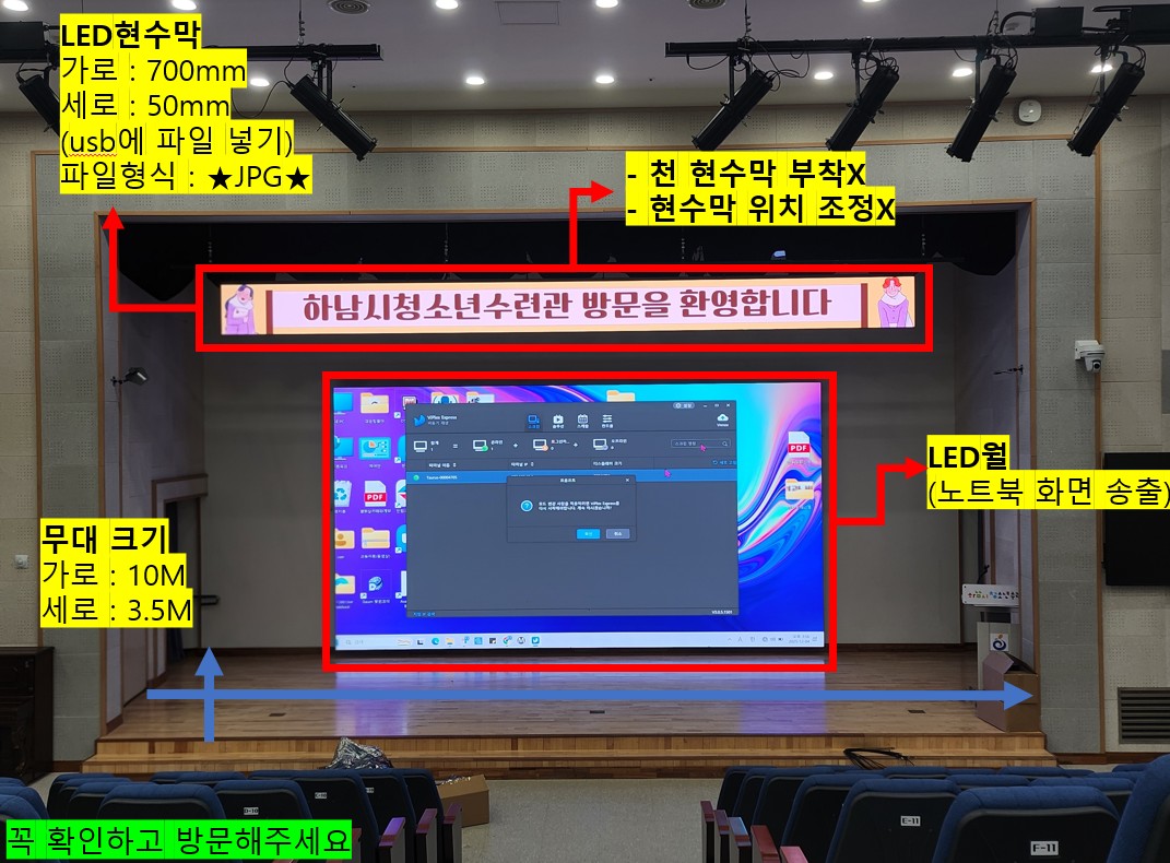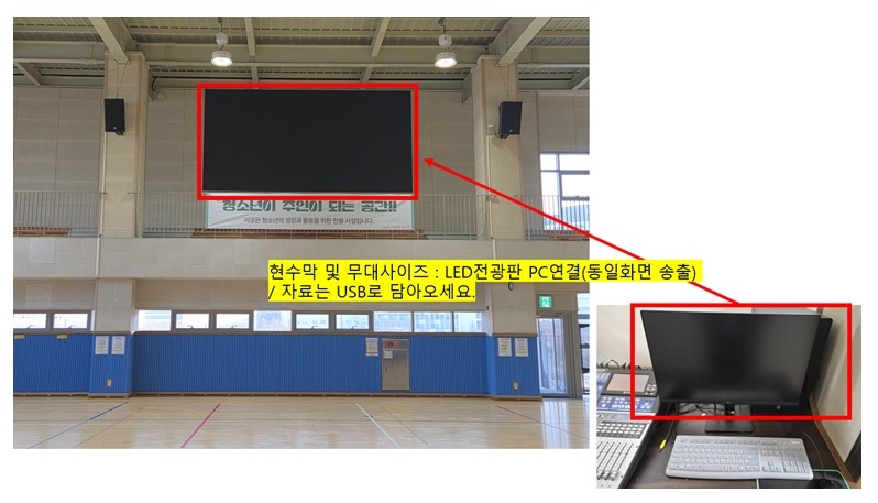 - LED전광판: PC연결(동일화면 송출) / 자료는 USB로 담아오세요.